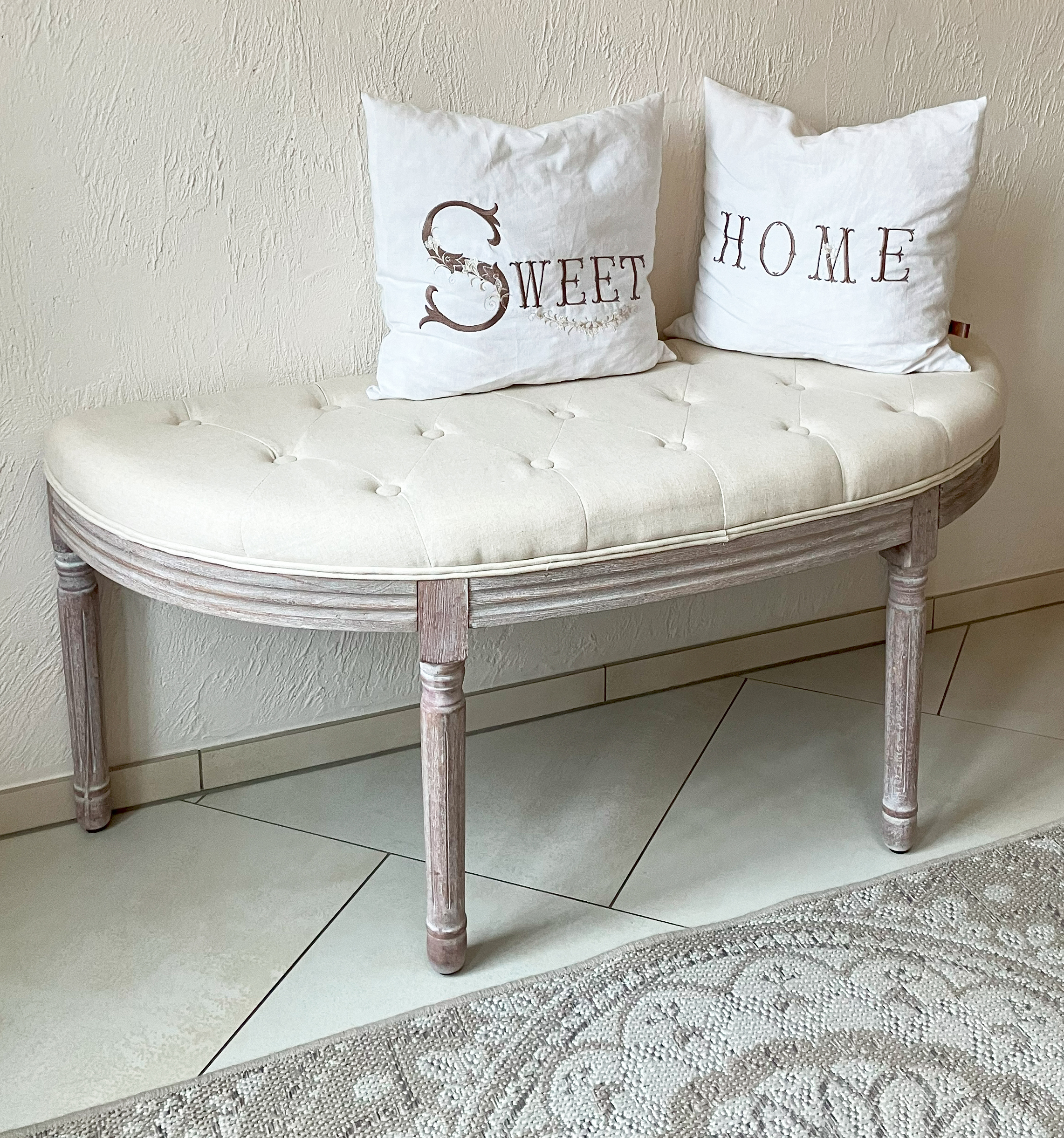 Die Kissen auf unserer Flurbank habe ich vor ein paar Tagen aus einem „Leinenstoff mit Geschichte“ genäht und sie passend dazu bestickt. Der Stoff stammt von einem alten Betttuch, welches mir meine Schwiegermutter vor einigen Jahren geschenkt hat. Endlich hat es seine Bestimmung gefunden und wird angemessen gewürdigt!
